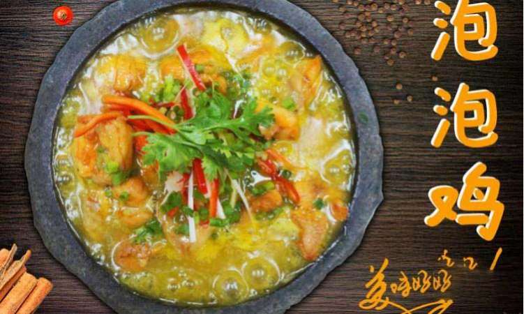 泡泡鸡培训:泡泡鸡是一款创新石锅菜品,鸡块经秘制方法炸制后入热石锅,倒入不同的料汁,上桌后咕嘟咕嘟冒泡,所以又叫泡泡鸡。泡泡鸡形式新颖,汤汁浓稠,鸡块入味,搭配米饭食用别有风味。