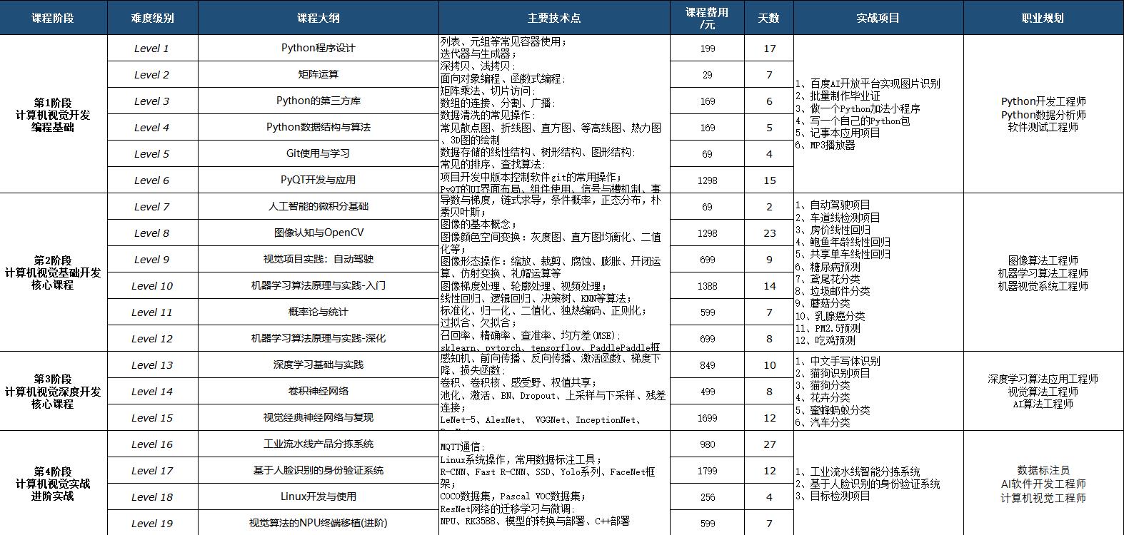 培养计算机视觉开发工程师, 学员可以胜任机器学习工程师,图像处理工程师,计算机视觉开发工程师,模型压缩工程师/模型压缩与部署工程师,数据标注员,智慧交通算法工程师/自动驾驶算法工程师岗位。