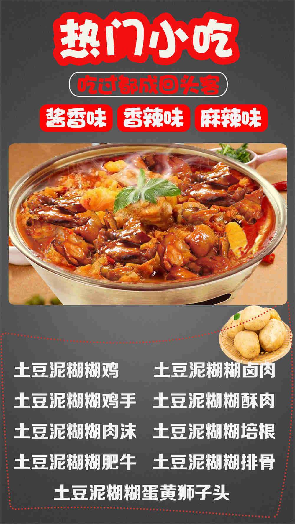 土豆泥糊糊鸡是新兴的餐饮新宠,不加一滴水的土豆泥,加上各种肉类搭配一起,口感绵滑,味道醇厚,回味无穷,让人吃完还想吃,无论是堂食来还是外卖,都生意火爆,操作简单,1到2人就能经营,是小本创业的优选。